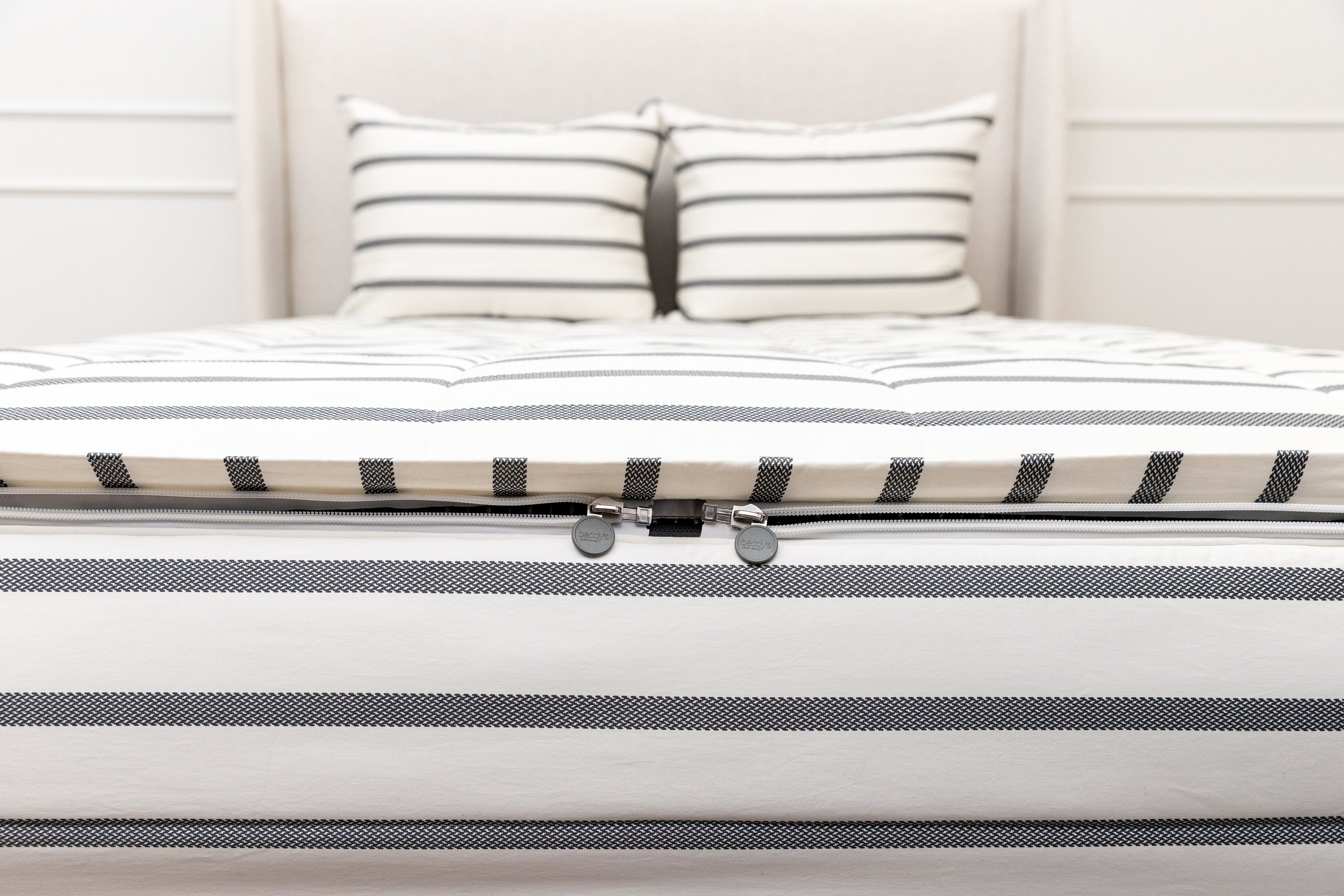 - Zippers line both sides of this striped bedding set, and the top is completely removable