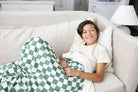 We’ve taken extra time to develop the perfect exterior fabric to make this the best travel blanket; it’s lightweight, breathable, soft and stretchy while the inside features our signature plush minky. It’s like getting two blankets in one! Think of it like an adult swaddle blanket: it's perfectly stretchy and warm, providing the perfect coverage so you can wrap yourself up tightly in this warm embrace of a blanket.