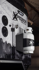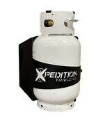 Powder-coated aluminum propane tank harness with custom laser cut Xpedition Trailers logo. Fits 11 lb propane tank (not included). For those long adventures off-the-grid!