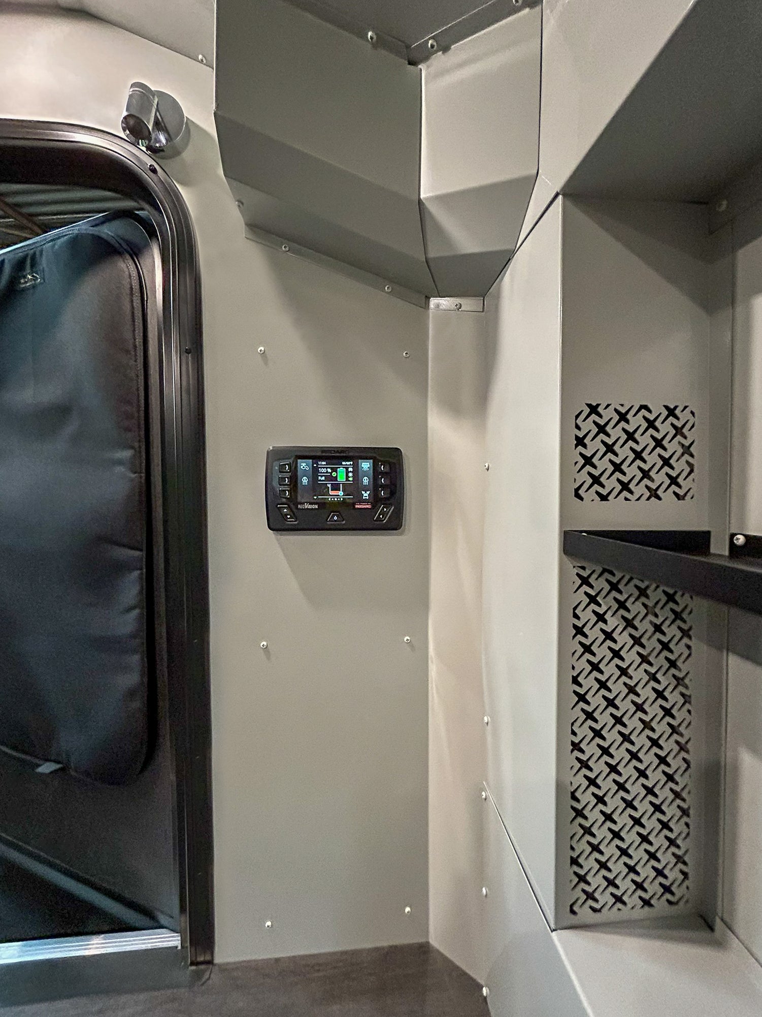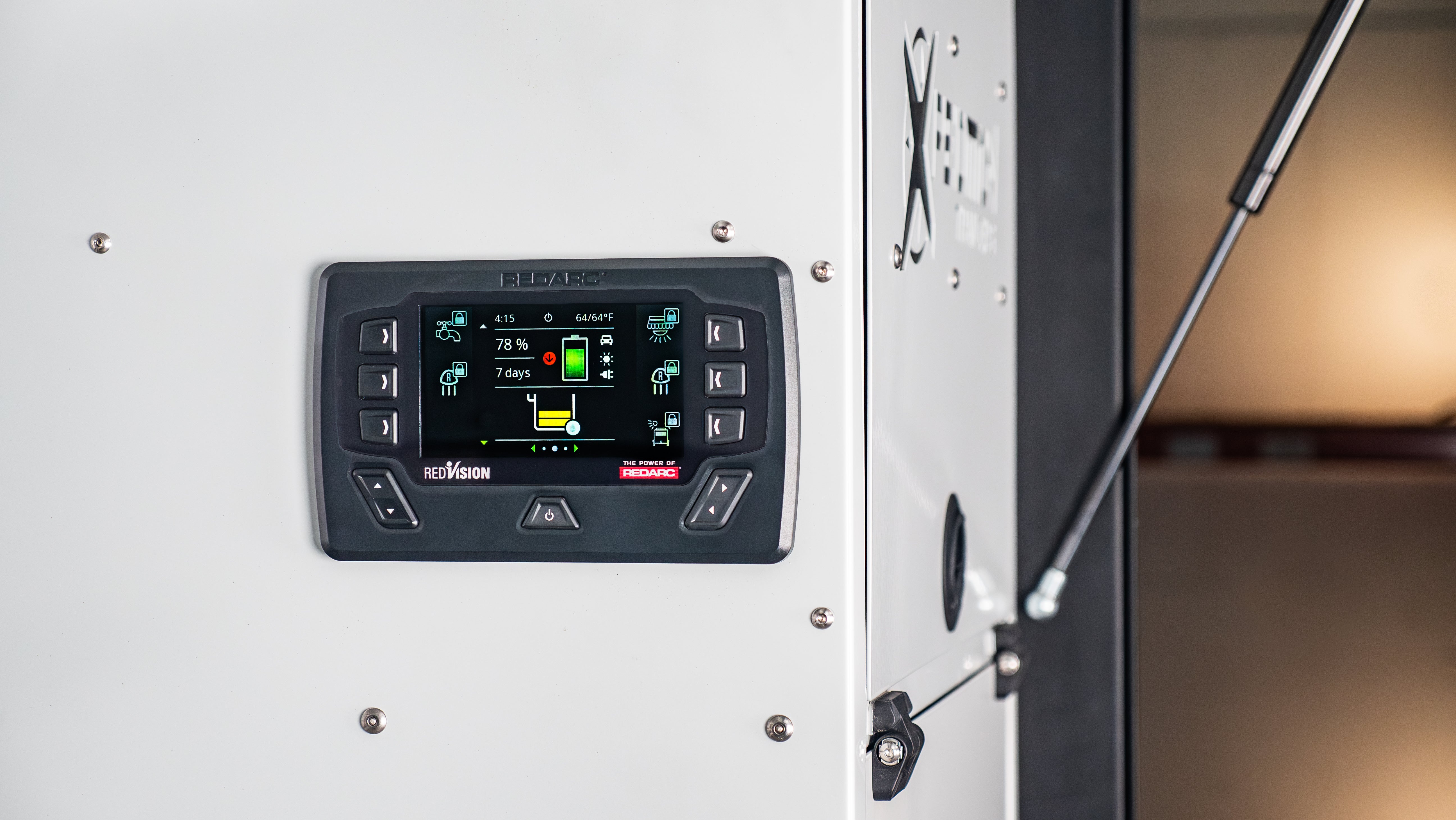 Touchscreen + Bluetooth hub. View battery %, water tanks, temps, switch any load, or trigger presets from phone or panel.