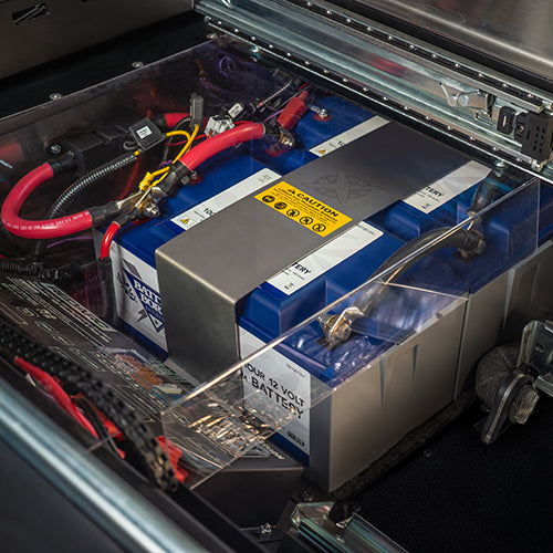 Two 100 Ah LiFePO₄ batteries: light, safe, 3,000+ cycles, internal heaters for subfreezing charge protection (Lithium standard with XE & XEL packages).