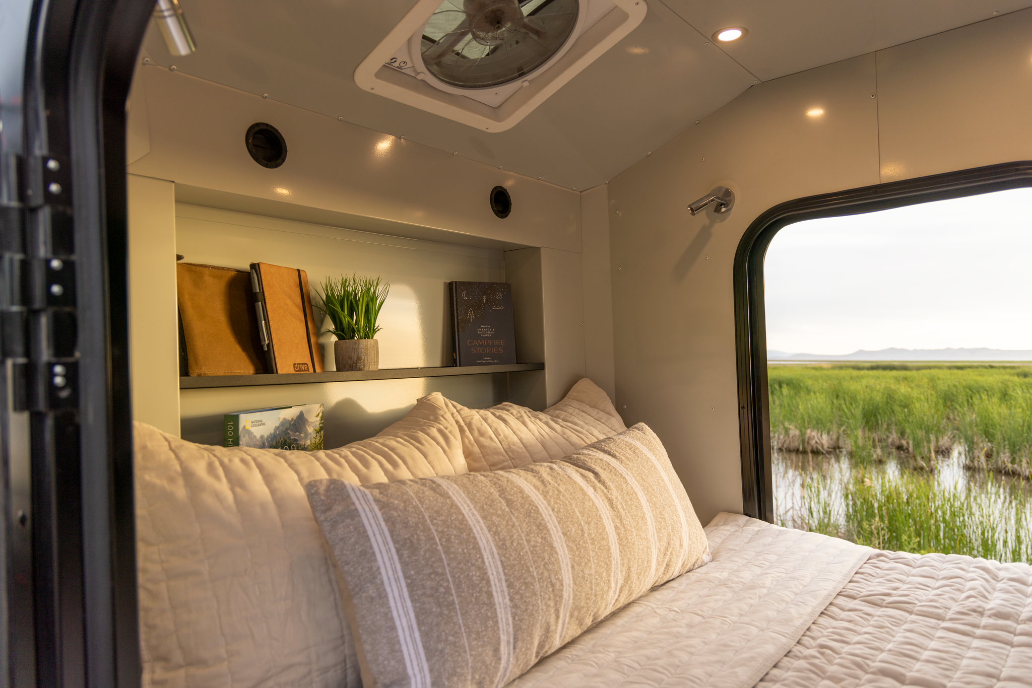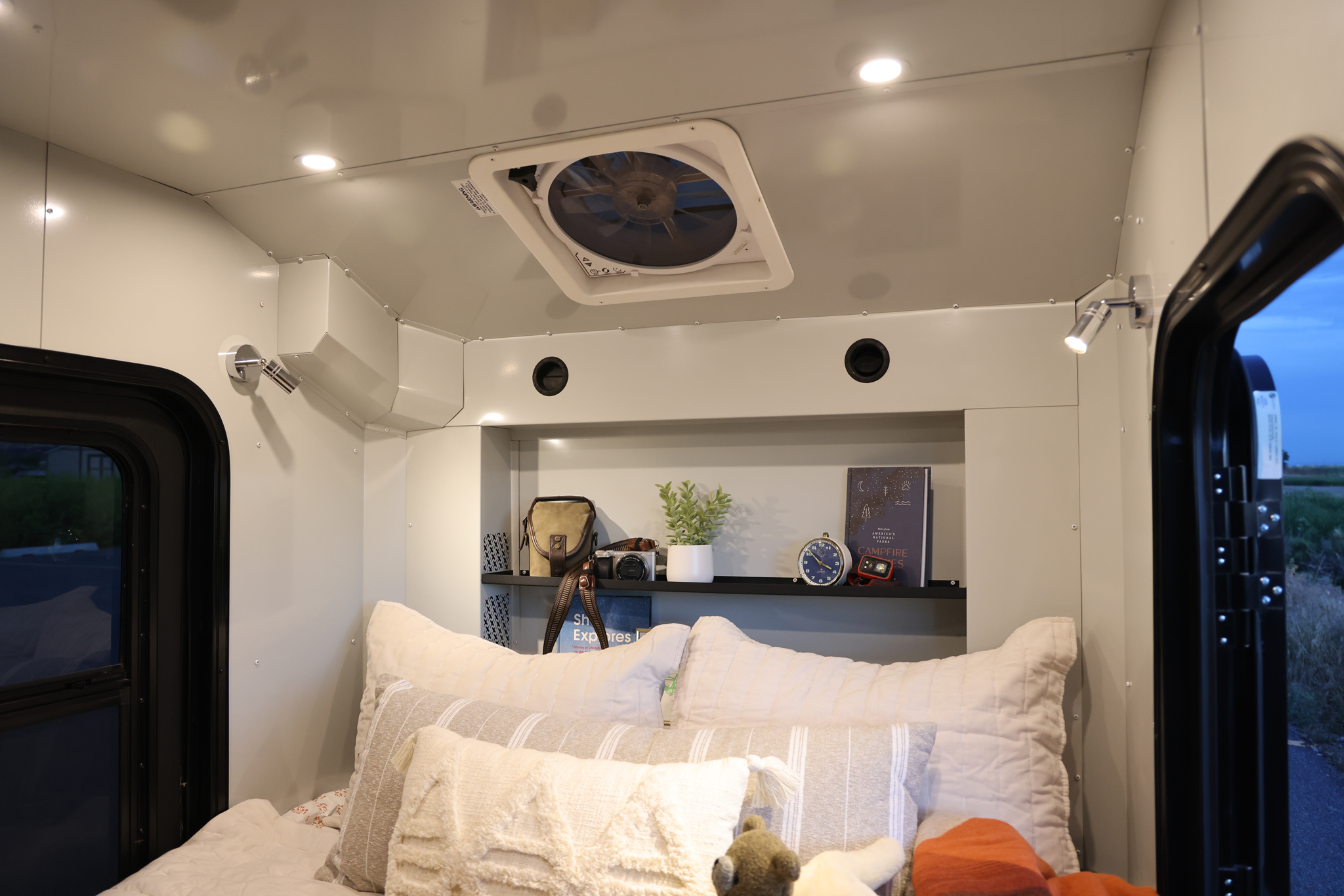 The same features that keep you warm in winter also help in summer. The insulation works to block out extreme heat, keeping the interior cooler during the day. Each Voyager also comes with a reversible roof fan and large screened windows on both doors, which together pull in breezes and vent out hot air – often that’s enough to stay comfortable on summer nights. For peak summer heat or desert conditions, the Voyager is A/C-ready: it has ports and a shelf for an air conditioner. You can add the optional A/C unit to enjoy chilled air on demand. Many owners use a small portable or window AC at hookups or with a generator when camping in 100°F+ environments, effectively turning the trailer into a refreshing retreat from the sun.