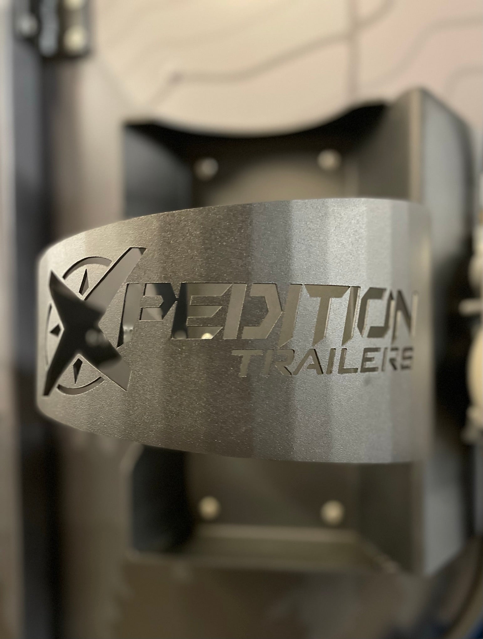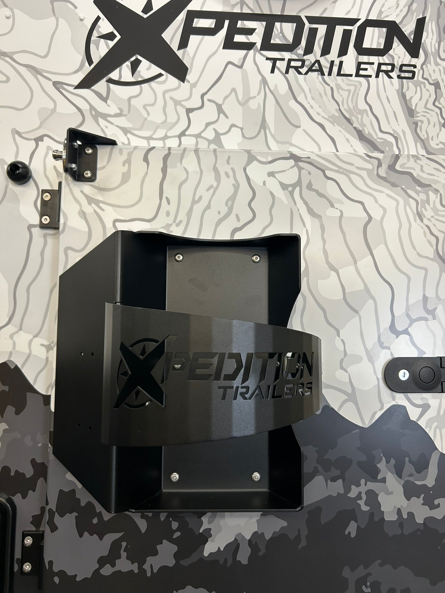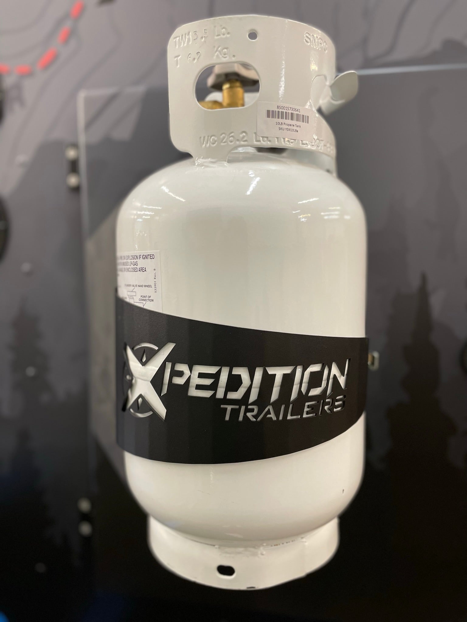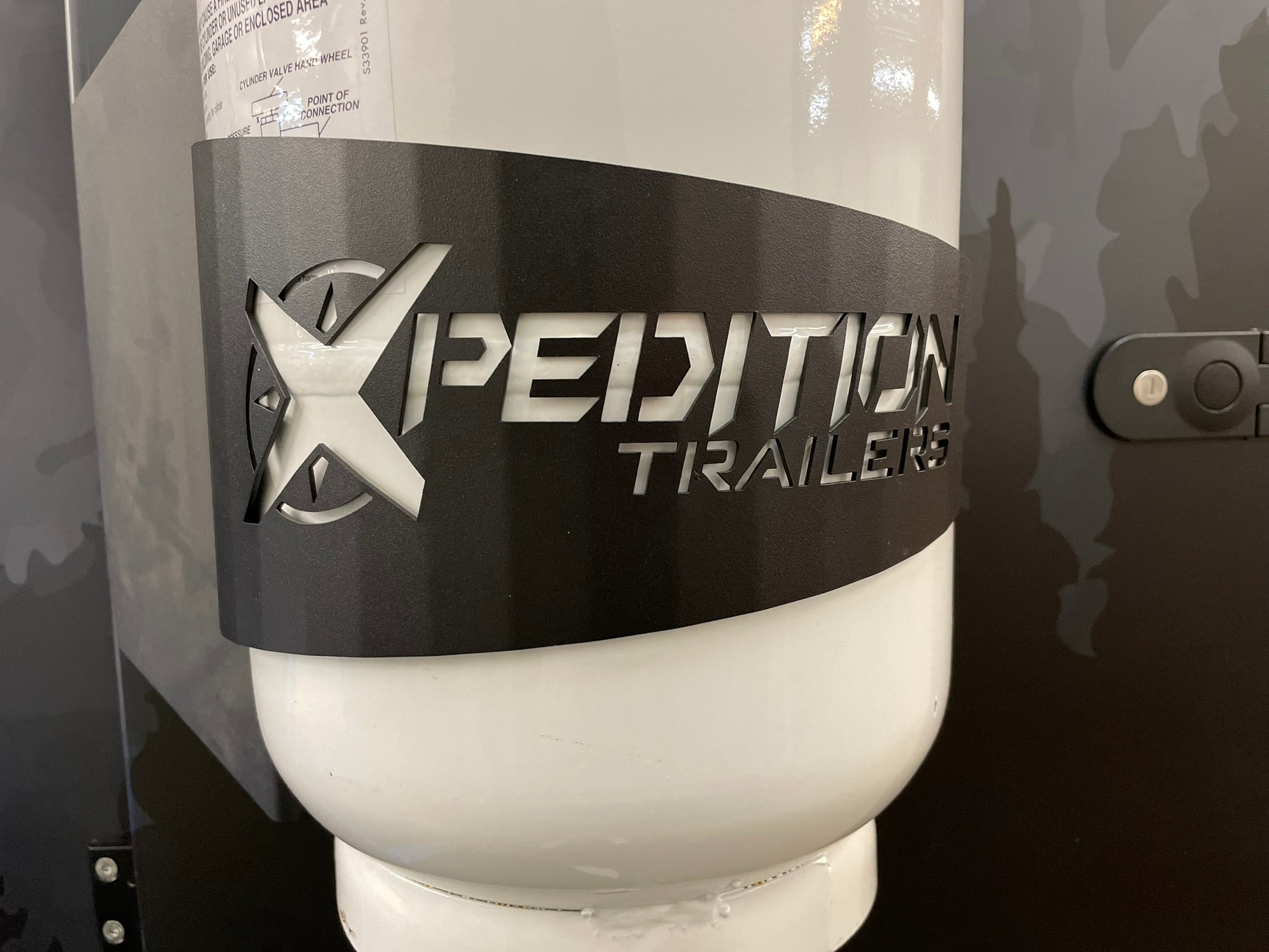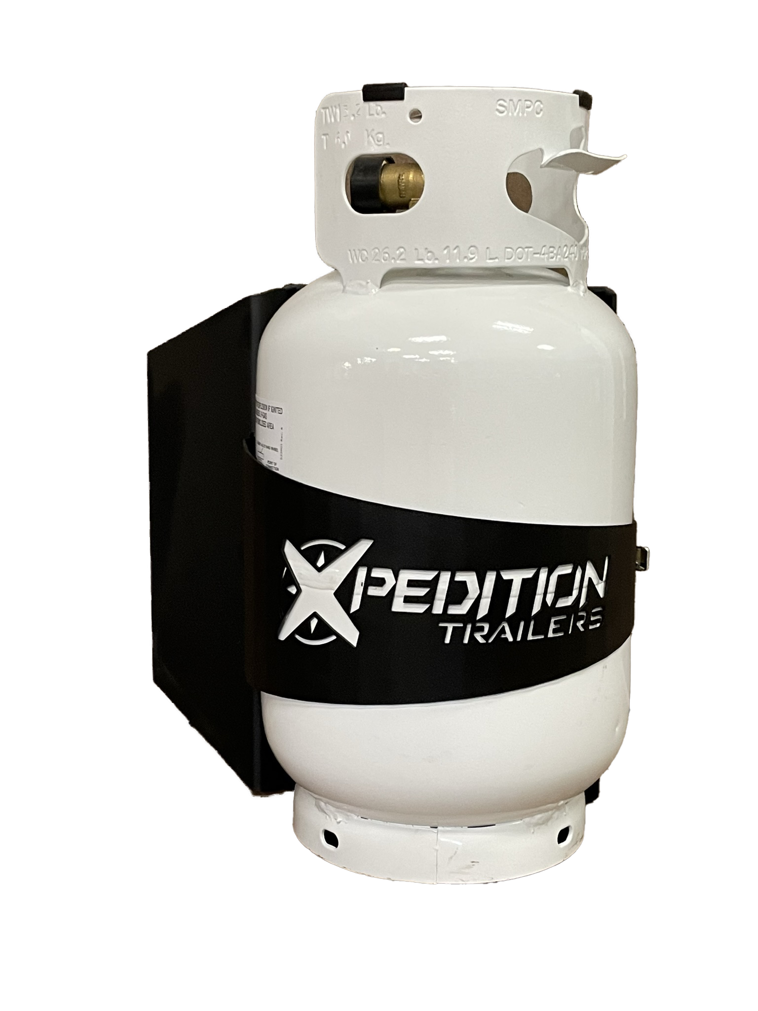 Powder-coated aluminum propane tank harness with custom laser cut Xpedition Trailers logo. Fits 11 lb propane tank (not included). For those long adventures off-the-grid!